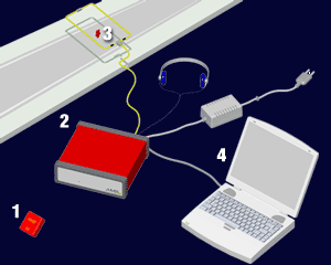 Below is the Rechargeable Transponders used to track lap times of the individual racers and the decoder to process information to be sent to the race computer. The charging rack is both a holder and charger. Racers take the assigned Transponder from this rack and install it into their R/C model before each heat or main and it is held in place by a body clip.