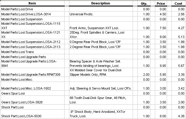 Below is an edited Excel form I managed to publish in gif format allowing you to view my remaining Team Losi Parts. The "Price" column would be what I would normally sell the item for and the "Cost" column shows what I paid for the items minus any shipping charges. I will let these parts go for the cost price on a first come/first serve basis until all items are sold out. Please take the part numbers of any items you are interested in